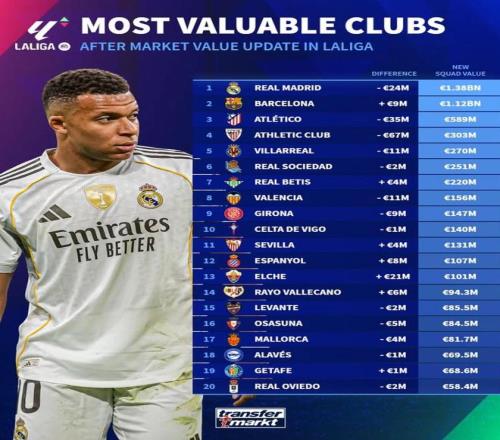 3. 马德里竞技 5.89亿欧元(-3500万欧元)