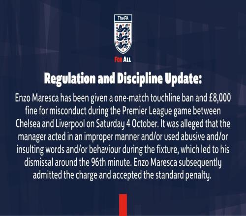 北京时间10月15日,英足总官方发布公告,公布了对马雷斯卡的处罚措施,后者在对阵利物浦的比赛中被红牌罚出场外。英足总官方公告:马雷斯卡因为在10月4日切尔西对阵利物浦的比赛中