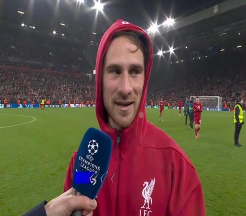 本赛季欧冠联赛阶段第4轮,利物浦主场1-0战胜皇马。利物浦球员麦卡利斯特接受了赛后采访。今晚表现出色,又一次攻破皇马球门,而且这次还是制胜球。你怎么形容这个夜晚?非常感谢。
